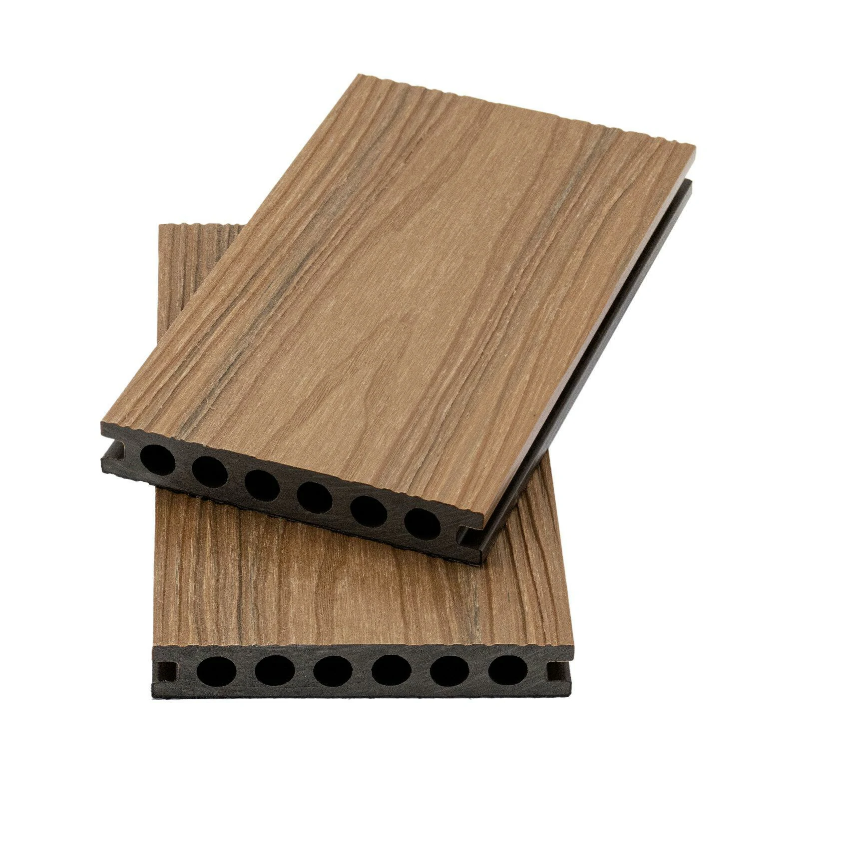 Capped Co-extrusion WPC Decking (Round Hole, 140x25x2900mm) features a unique round-hole structure designed for superior compressive strength and dimensional stability. Utilizing full-wrap Capped technology, it is 100% waterproof and UV resistant, tailor-made for high-traffic commercial areas and municipal projects. Full customization options available for colors and surface textures.